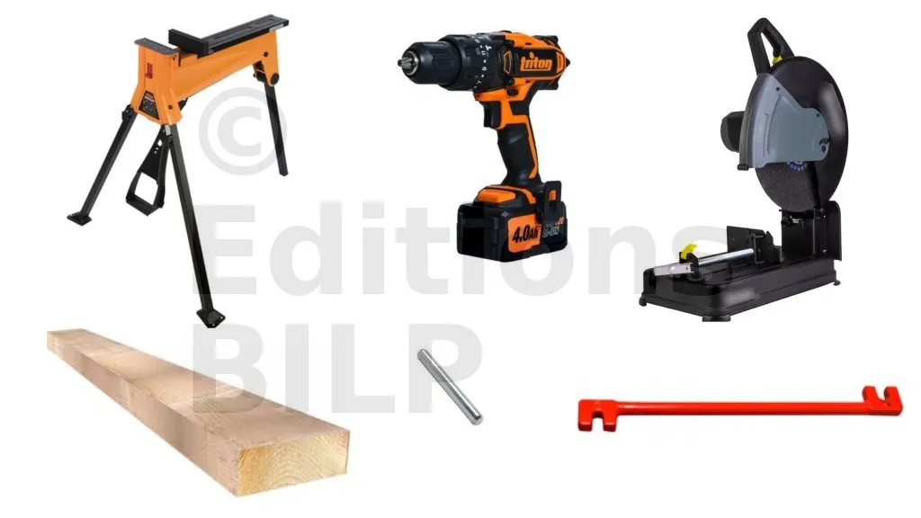 Pour la réalisation de la cintreuse, nous avons utilisé des étau-tréteaux comme un établi sur lequel nous avons posé un madrier de 100 x 200 mm avec une longueur de 1 m. Il nous faut également des outils comme une perceuse, une tronçonneuse à métaux, un griffe et des broches de 12 mm de diamètre et une longueur de 200 mm.