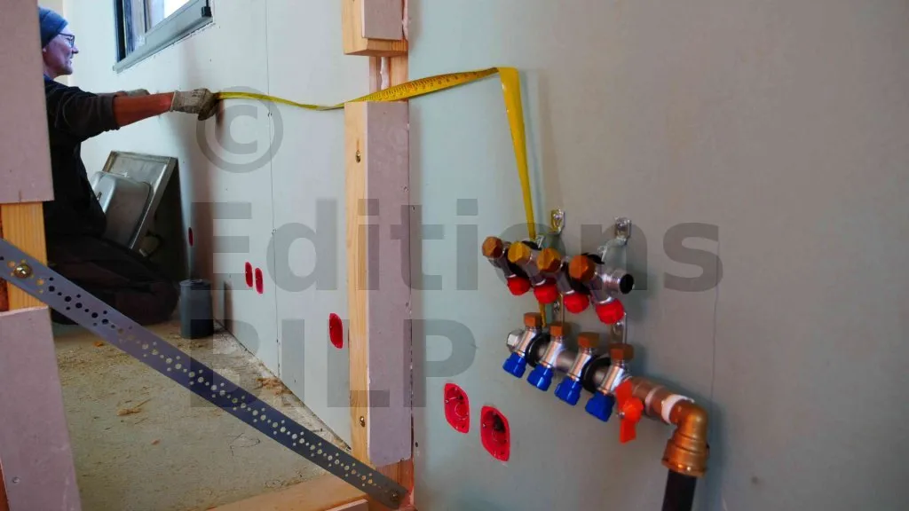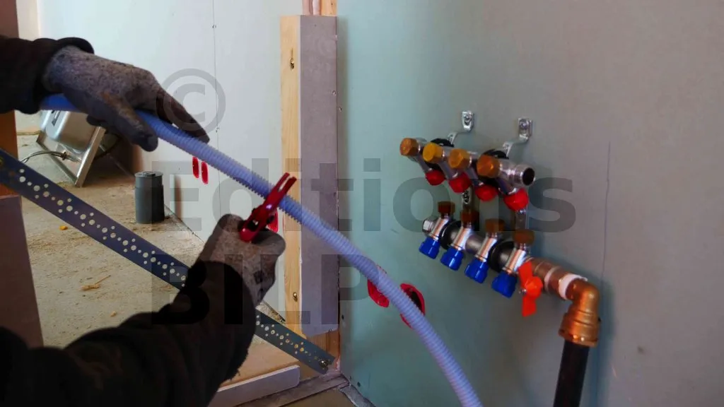 Avant de retirer les bouchons des connecteurs d’arrivée d’eau froide (connecteur bleu) et de sortie d’eau chaude (connecteur rouge), coupez l’alimentation en eau. Ensuite, appliquez du ruban téflon dans le sens des filetages des connecteurs. Installez et fermez la vanne d’arrêt. Rétablissez l’eau pour vérifier les fuites. Si nécessaire, renforcez l’étanchéité en ajoutant plus de ruban téflon.