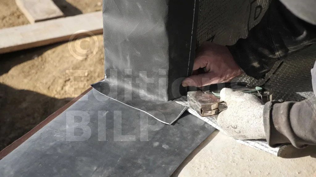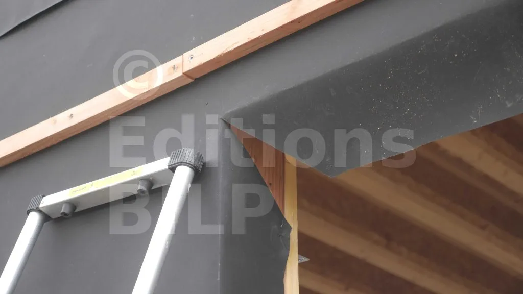 Aux angles de l’ouverture, il faut couper le pare-pluie en diagonale en partant des coins de l’ouverture et avec un angle de 45°. Cette coupe en diagonale permet de réaliser le rabattement du pare-pluie vers la face intérieure du mur de manière à ce que l’écran couvre complètement le bois d’ossature autour de l’ouverture, assurant ainsi une protection optimale contre l’infiltration d’eau.