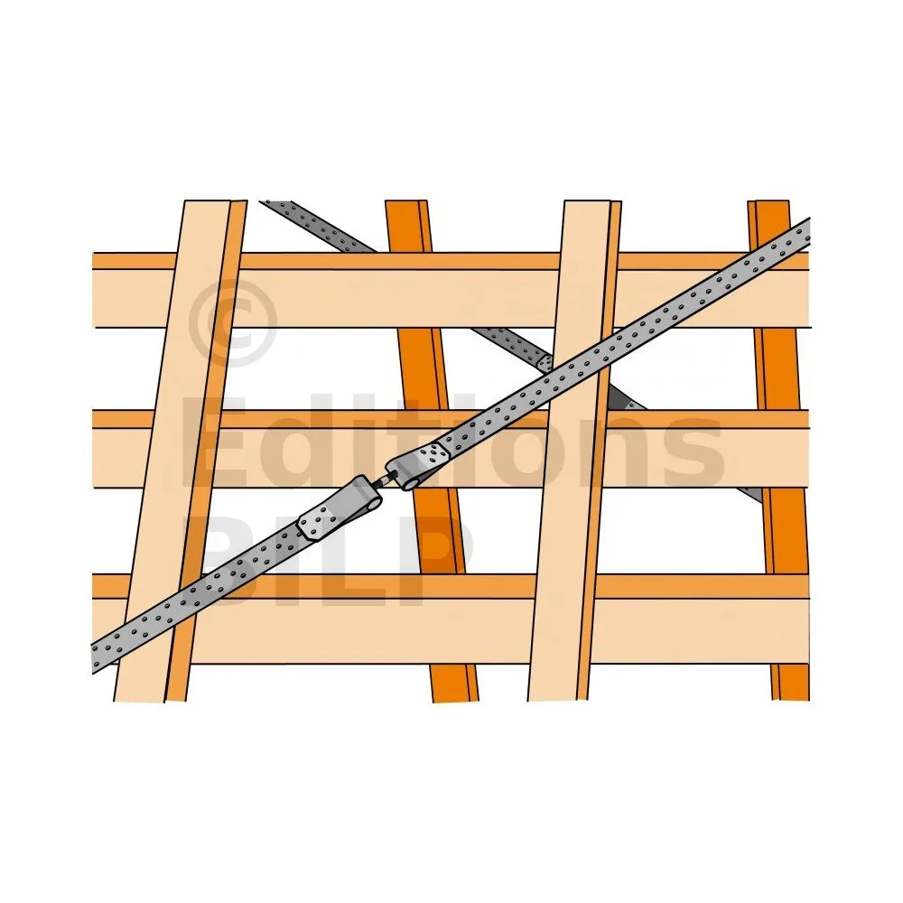 - Fixer l’autre extrémité de ces deux feuillards au tendeur FMBS afin de les associer au centre de la diagonale.