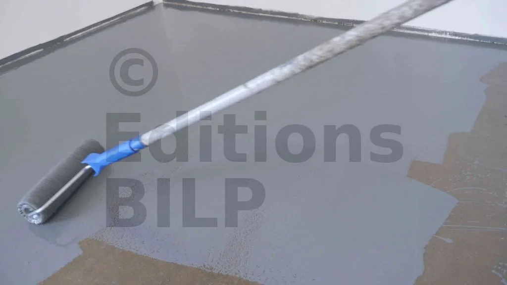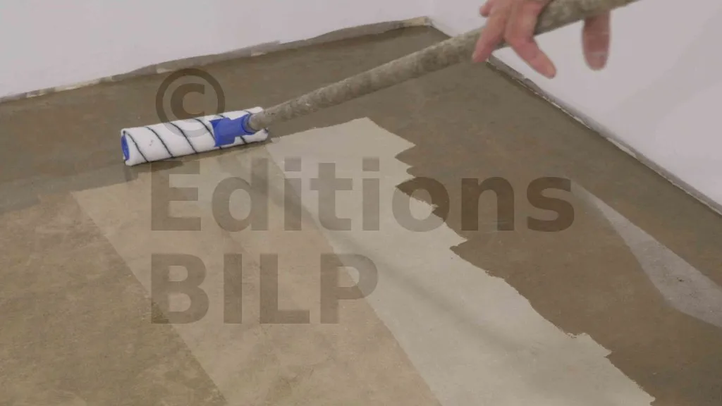 Le primaire s’applique ensuite au rouleau à poils courts, comme une peinture. La couche doit être fine et bien répartie. Il faut respecter le temps de séchage indiqué par le fabricant (généralement 8 à 24 heures).