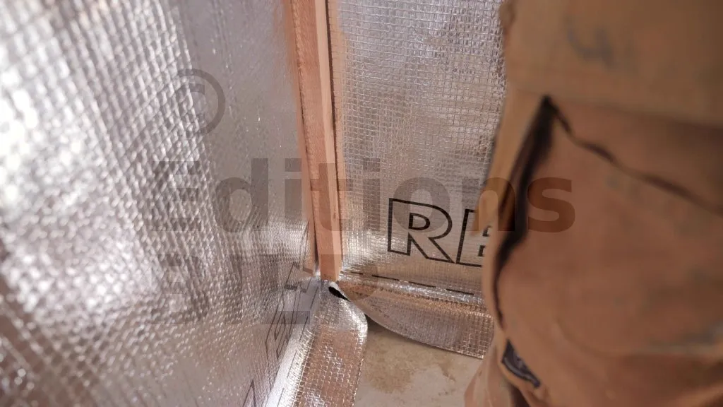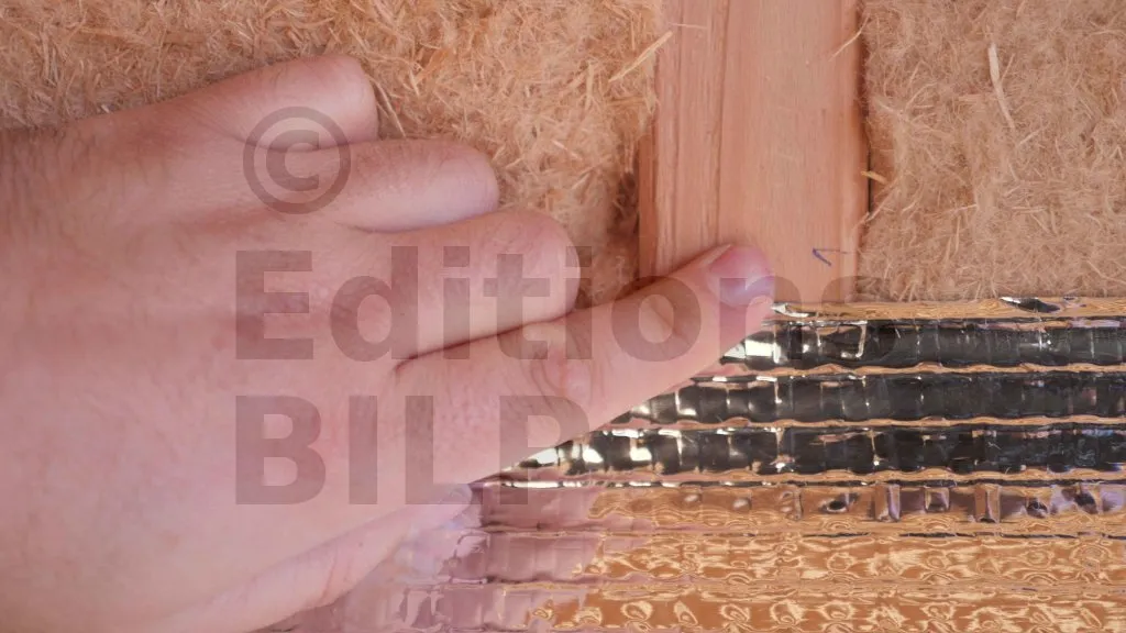 Pour maintenir le pare-vapeur au niveau des angles, des baguettes ont été installées afin de le maintenir en place jusqu’à sa fixation définitive par agrafage. Il est crucial de lisser soigneusement le film pour éviter la formation de plis ou de poches d’air, assurant ainsi une étanchéité optimale.