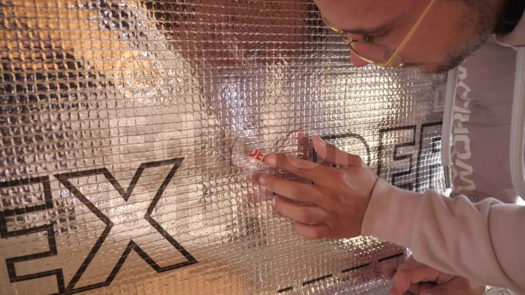 Le recouvrement de chaque lé doit être d’au moins 10 cm. C’est pourquoi il est important de repérer l’alignement de chaque lé. Les repères sont marqués sur les montants d’ossature, afin d’assurer une disposition horizontale parfaite des lés, d’éviter les plis et de garantir une étanchéité optimale.