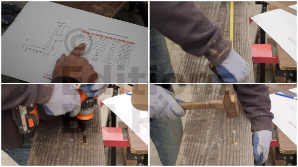 Après avoir pris les dimensions de chaque armature, celles-ci sont rapportées en prenant comme point de référence l’emplacement de la première broche. Le trou destiné à la broche est réalisé à l’aide d’une perceuse équipée d’une mèche à bois de 11 mm de diamètre. La broche est ensuite insérée dans son emplacement en laissant dépasser environ 10 cm au-dessus de la surface du madrier, et les opérations sont répétées pour les autres broches de la même rangée.