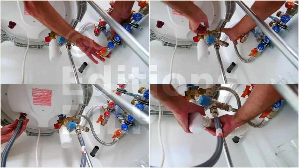 Présenter puis visser les flexibles entre le collecteur (vannes bleues/rouges) et le groupe de sécurité sous le ballon, en les alignant pour qu’ils ne se tordent pas. Côté arrivée d’eau froide, monter le raccord en T et le réducteur de pression, puis serrer sans forcer en maintenant le groupe pour ne pas le faire pivoter. Raccorder ensuite les flexibles au ballon : bleu = entrée eau froide (via le groupe), rouge = sortie eau chaude ; poser les joints et serrer modérément. Brancher l’évacuation du groupe sur un siphon avec une pente régulière, en s’assurant que le passage n’est pas bouché. Si possible, isoler les flexibles, puis rouvrir l’eau et vérifier qu’aucun raccord ne fuit.