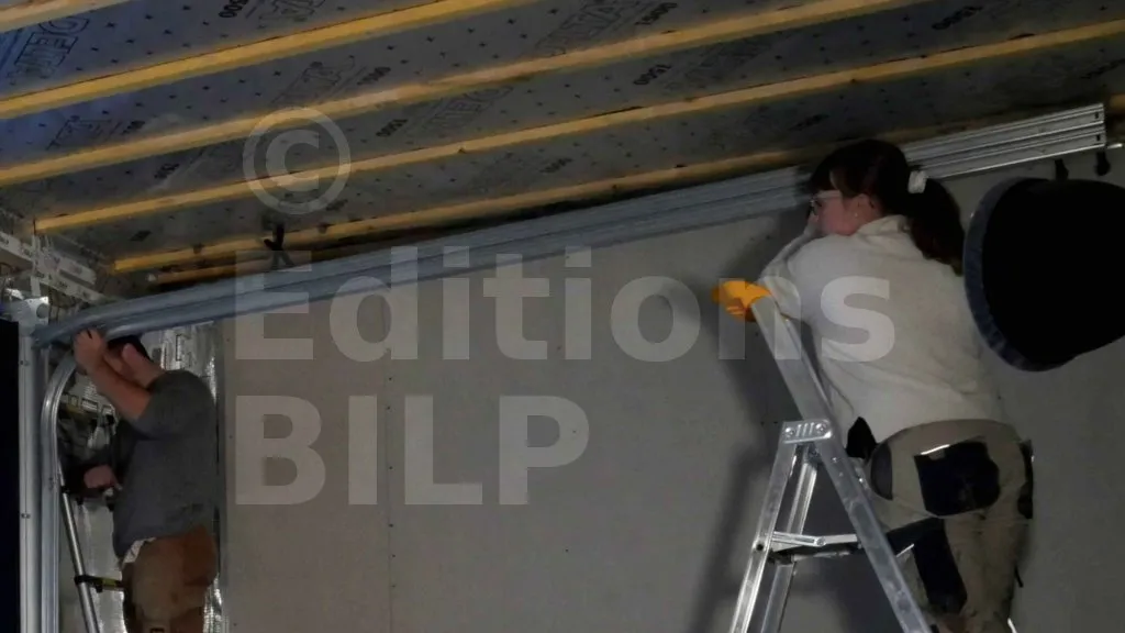 Une fois le pré-perçage effectué, remettez en place les éléments de la structure. Ensuite, les fixations sont réalisées à l’aide des vis de fixation fournies par le fournisseur de la porte. Si le fournisseur ne fournit pas les fixations, la structure est fixée à l’aide de tirefonds munis de rondelles et de cales fourchettes placées entre les rails et les montants de l’ossature des murs, afin d’éviter la déformation des rails pendant le vissage..