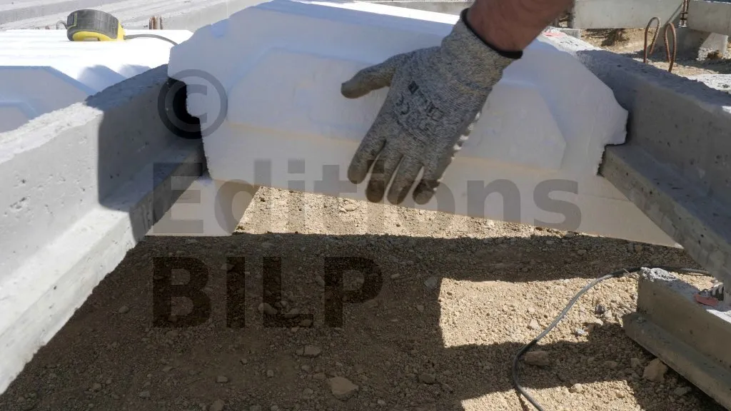 Ces hourdis prennent appui sur les longrines de rive par l’intermédiaire de leur emboîtement mâle, d’une part, et grâce aux coupes pour obtenir un appui de 20 mm minimum sur les longrines intermédiaires. En général, ce sont les EcoRupteurs [1] qui sont placés à l’extrémité ; cependant, dans le cas du projet Maison BILP, il s’agit de hourdis en polystyrène ordinaire.
