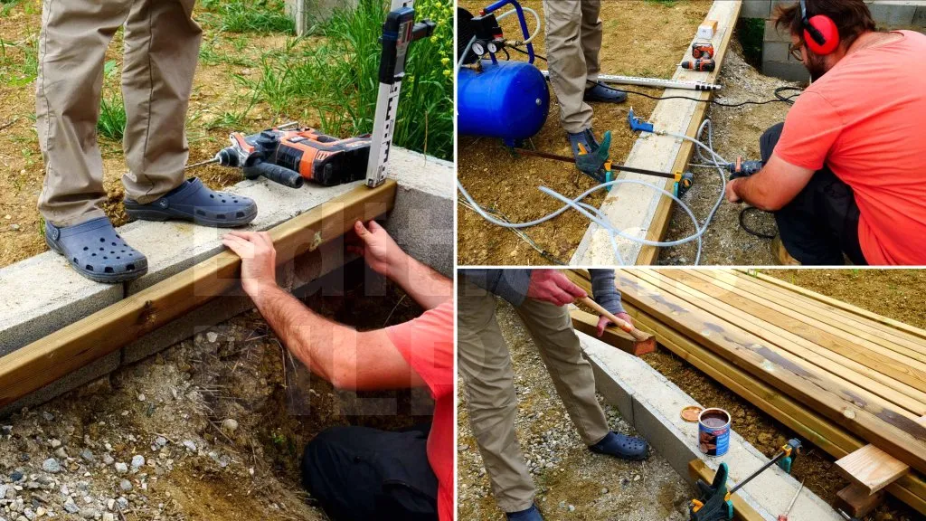 Repérez et tracez l’implantation de la lisse sur la maçonnerie, puis préparez-la : coupe à longueur, et traitement des coupes. Il faut ensuite la positionner, puis pointez les perçages, et percez le support au bon diamètre en dépoussiérant les trous. La fixation adaptée vient ensuite, après calez et réglez pour obtenir le niveau. Résultat : une base plane, stable et durable, qui coupe les remontées d’humidité et reprend correctement les efforts. Avant d’abouter une pièce à une autre, pensez à enduire la section de la lisse de saturateur.