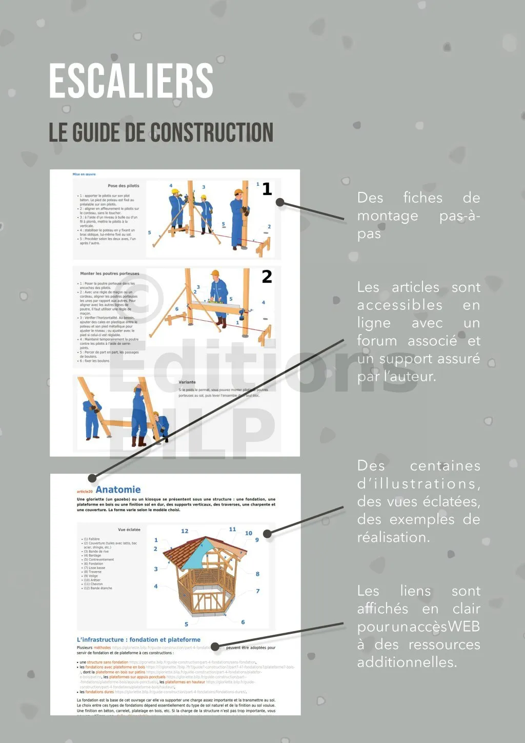 Des informations concrètes pour votre projet. Tous les secrets, tous les trucs et astuces pour réussir la construction de votre escalier. Toutes les techniques ainsi que tous les modèles vous sont décrits de façon objective et indépendante. Des vues détaillées pour vous décrire toutes les étapes de la construction.