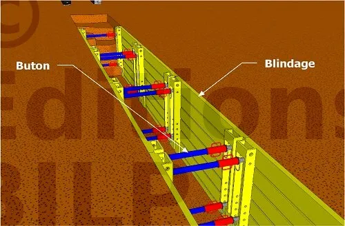 Le blindage des tranchées empêche les effondrements lors de la construction dans des terrains non cohérents. Ce blindage peut être réalisé à l’aide de fourreaux temporaires ou de busage en béton, assurant ainsi la sécurité et la stabilité des travaux.
