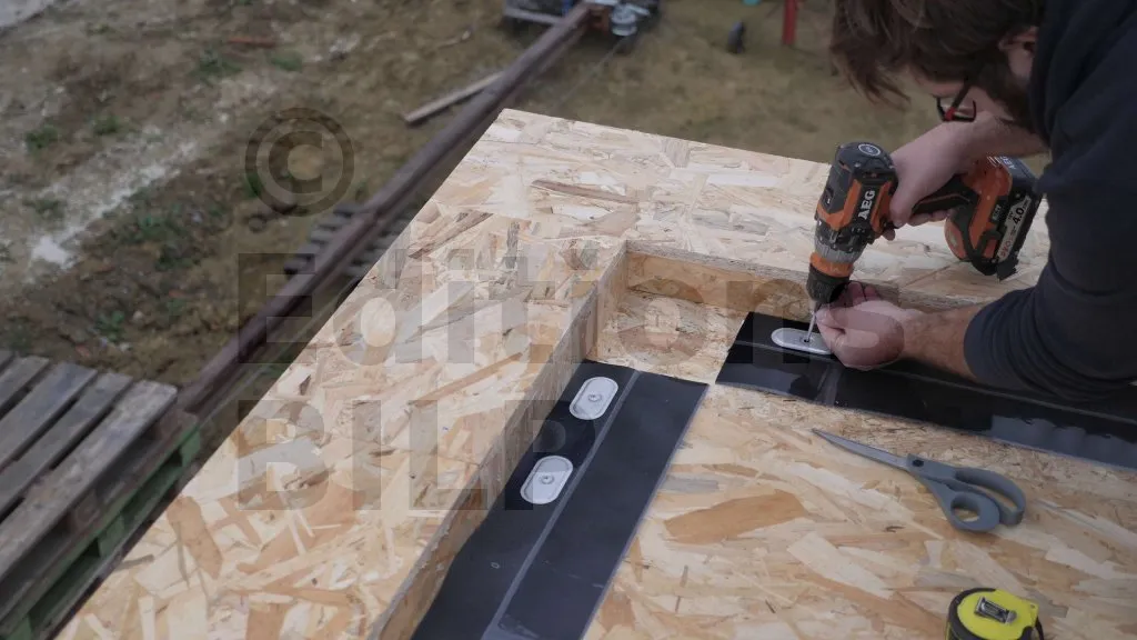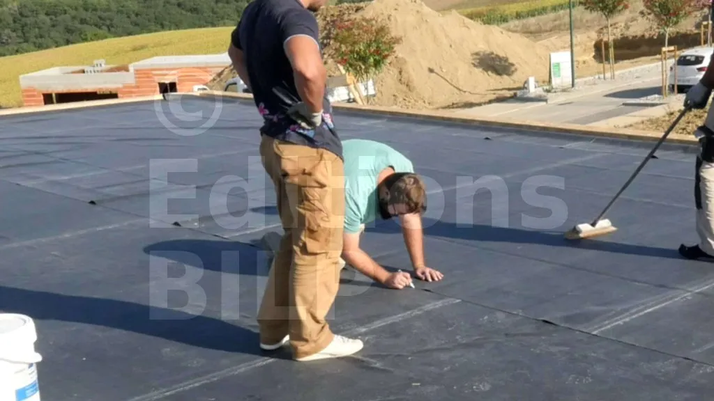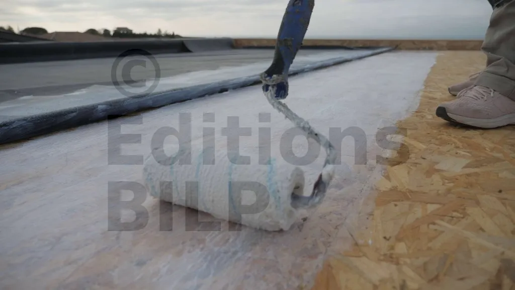 La membrane et le plancher de toiture sont enduits de colle sur une largeur maximale de 1 mètre à l’aide d’un rouleau à peinture. Une fois que la colle devient translucide et/ou collante au toucher, la surface enduite est dépliée et mise en contact avec le plancher de toiture.