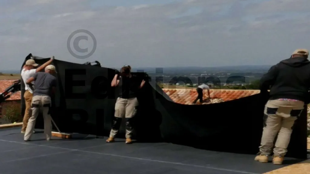 Pour évacuer les bulles d’air, la bâche (ou membrane) est marouflée à l’aide d’un balai avant de procéder à l’encollage suivant. Ensuite, le processus se répète jusqu’à ce que la première moitié de la membrane soit entièrement dépliée.