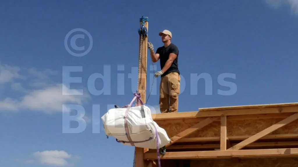 La toiture de la Maison BILP se trouve à 3,60 m du sol, il serait donc impossible de soulever les bâches sur cette hauteur. La solution qui a été adoptée pour les soulever est l’utilisation de palan.