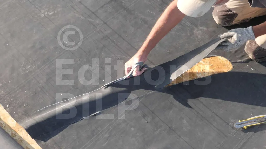 Il ne faut pas se presser : collez de petites surfaces à la fois, d’une longueur maximale de 40 cm. Pour ce faire, décollez le film plastique de la bande de flashing, puis rabattez le lé supérieur sur la bande en effectuant des mouvements de l’intérieur vers l’extérieur avec la main afin d’éliminer les bulles d’air, et ce, jusqu’à l’acrotère.