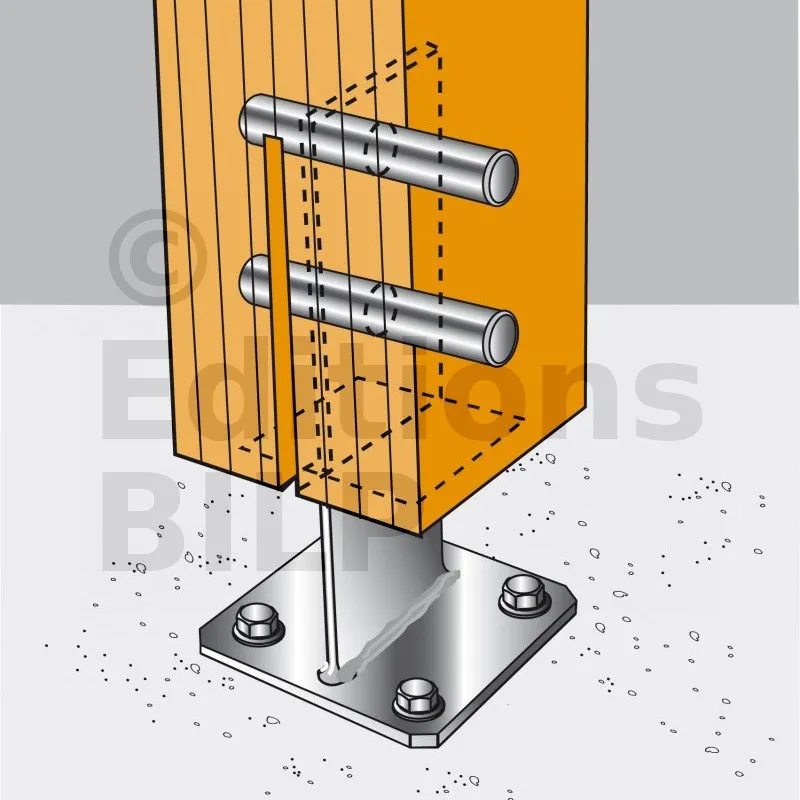 - Connexion bois sur support rigideSur poteau : 2 broches Inox Ø12 ou Ø16 ou Boulons inox Ø 12 mm ou 16 mm suivant perçages ; sur béton : 4Ø12 (goujons BOAX-II M12-104/5 A4 ; tige filetée M12) ; sur acier : Boulons inox Ø12