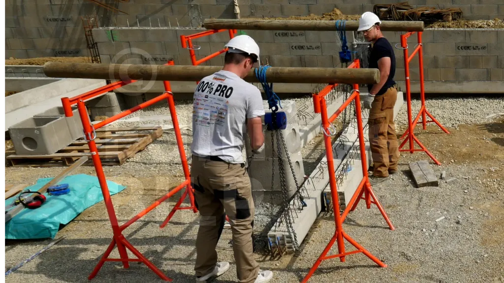 Quatre tréteaux réglables sont placés à côté des deux boucles de levage de chaque longrine pour la soulever verticalement. Pour le déplacement horizontal, il faut décaler les tréteaux par rapport aux boucles de levage dans la direction souhaitée. Ces tréteaux servent d’appuis pour les poteaux sur lesquels sont fixés les palans pour le levage.