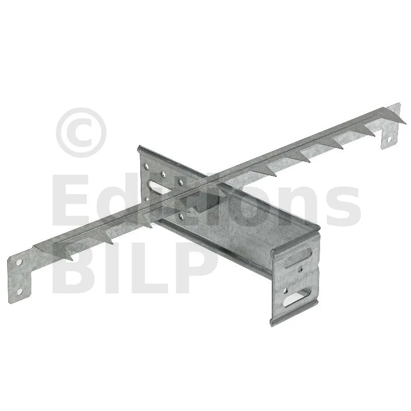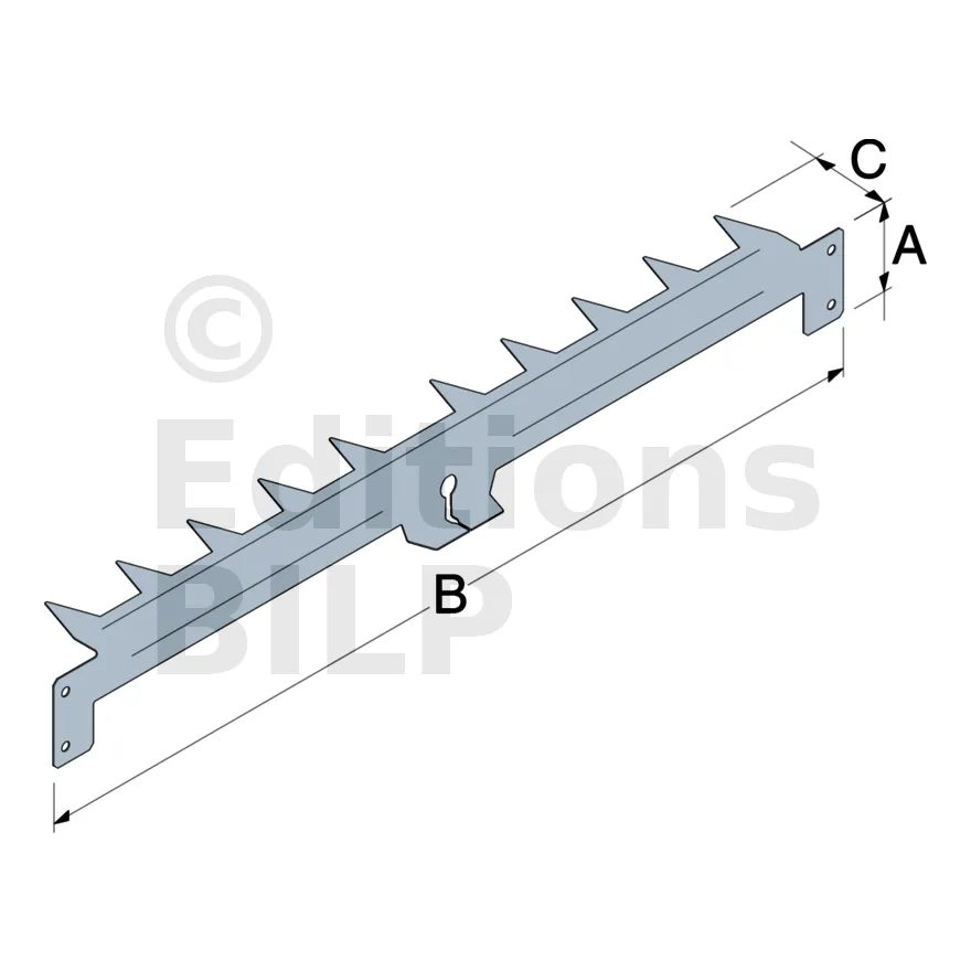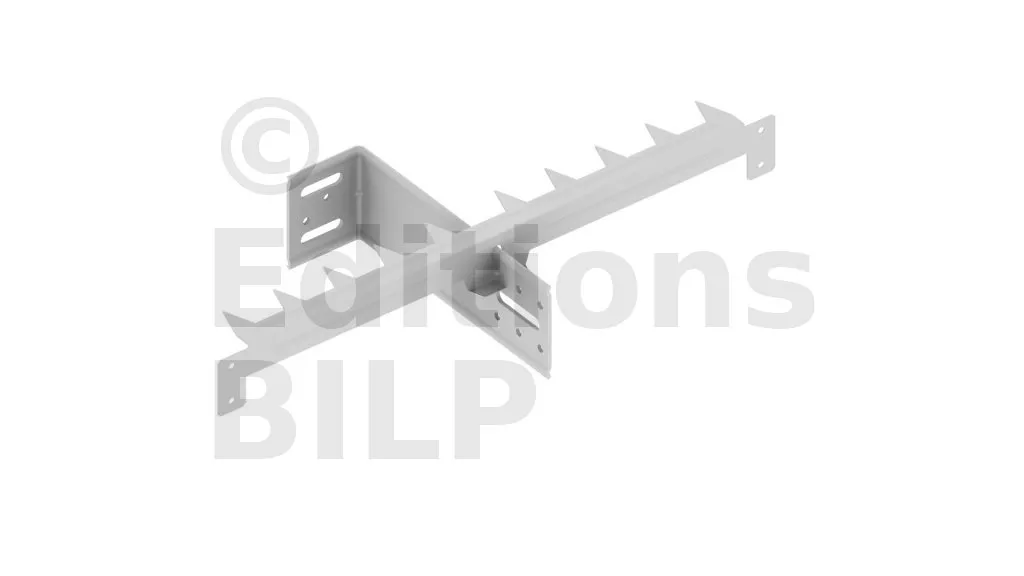 Il faut compter une griffe par équerre pour une bonne fixation de l’isolant. Peut-être coupée pour obtenir deux peignes à fixer sur les chevrons grâce aux deux ailettes qui permettront le maintien de la seconde couche d’isolation entre chevrons.