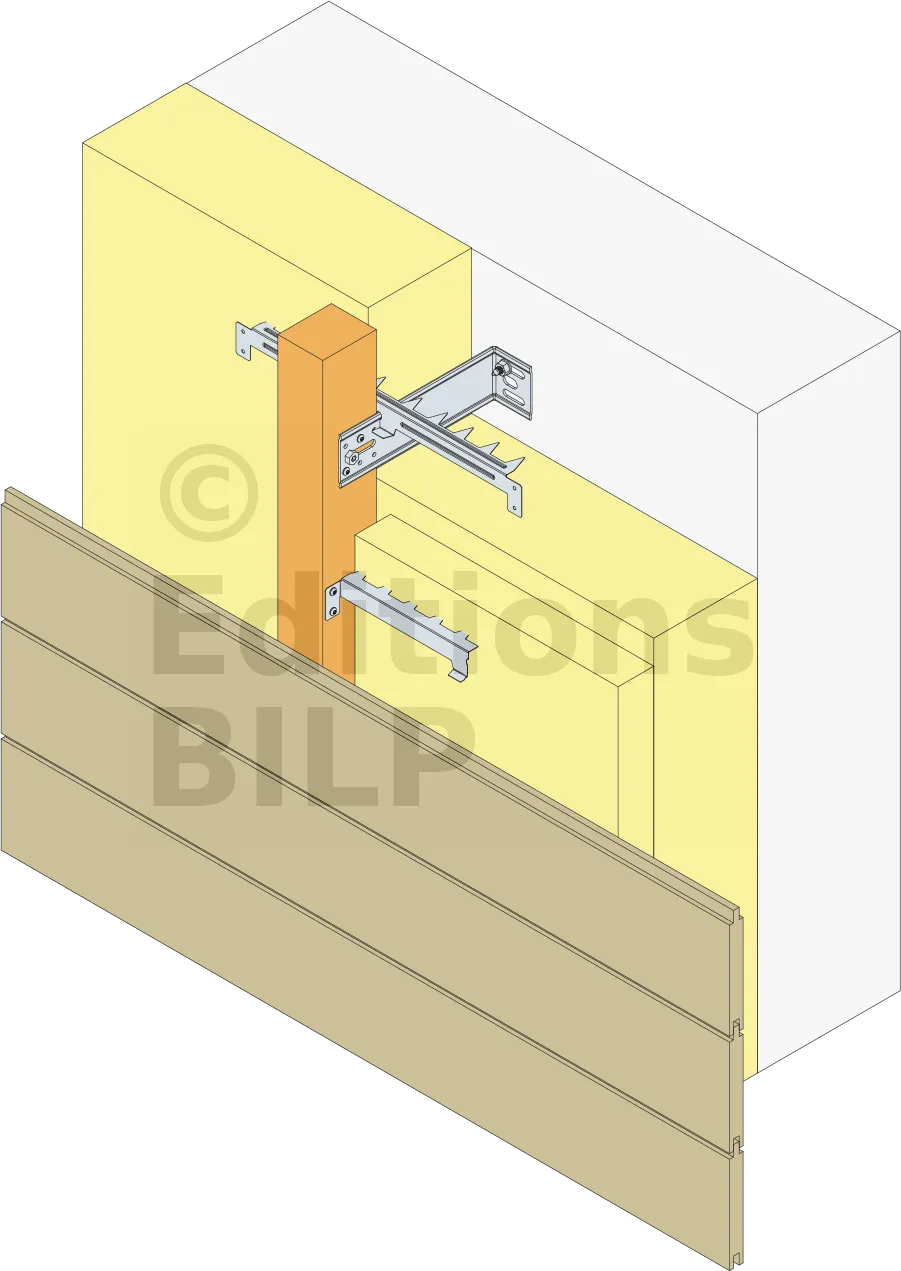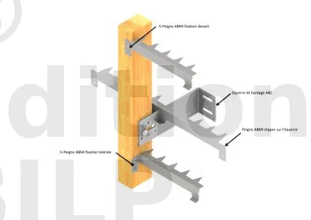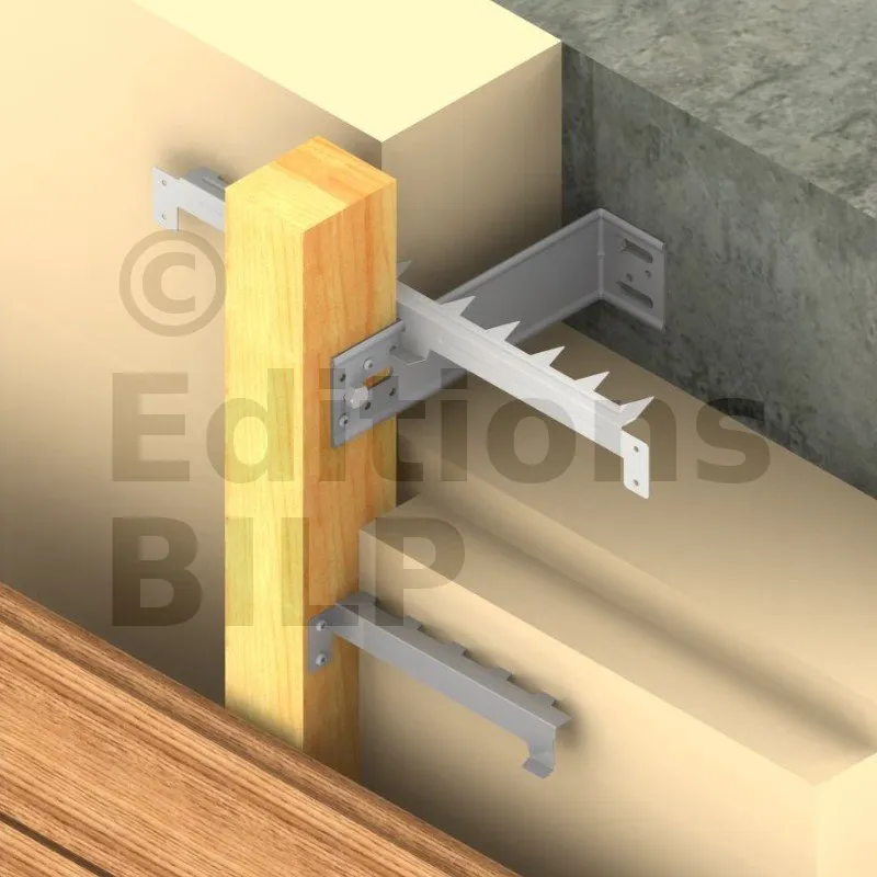 La griffe ABMI permet la fixation de l’isolant contre le support dans le cas d’une Isolation Thermique par l’Extérieur (ITE). Une griffe ABMI est nécessaire sur chaque équerre de bardage EBC.