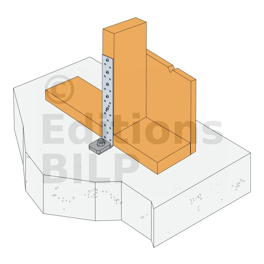 - Ancrage chimique : résine AT-HP + tige filetée LMAS M12 avec un tfix supérieur à l’épaisseur de bois à traverser + 12 mm.