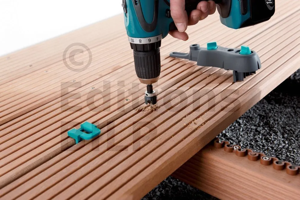 Cet outil permet de positionner avec précision les trous à percer dans la planche de terrasse, c’est-à-dire d’obtenir une distance très précise par rapport au bord de la lame, et d’aligner les trous de perçage en enfilade rectiligne.