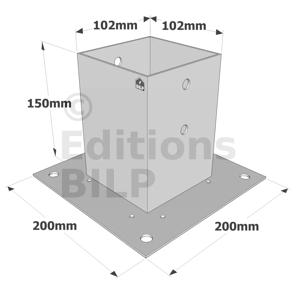 Pied de poteau carré sur platine "prêt-à-fixer"