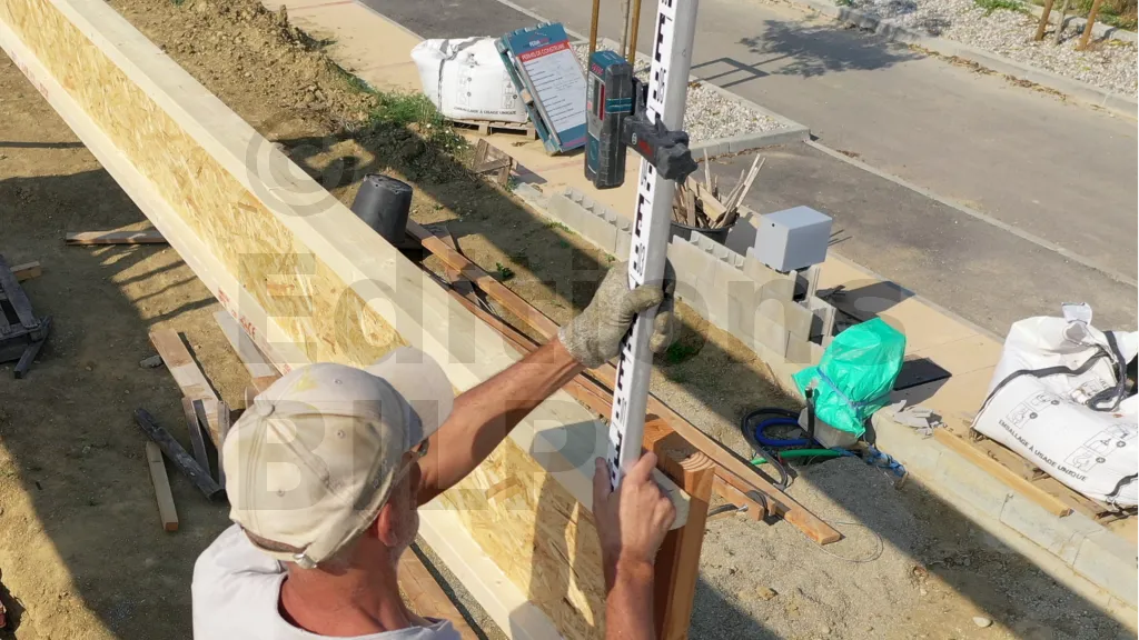 Les poutres situées aux extrémités sont posées en premier, car c’est sur elles que le cordeau, servant de guide pour l’alignement et la pente, est tiré. Ces poutres sont ainsi mises à niveau et vérifiées pour être bien d’aplomb. Pour cela, vous devez vous munir d’un niveau à bulle et d’un fil à plomb.