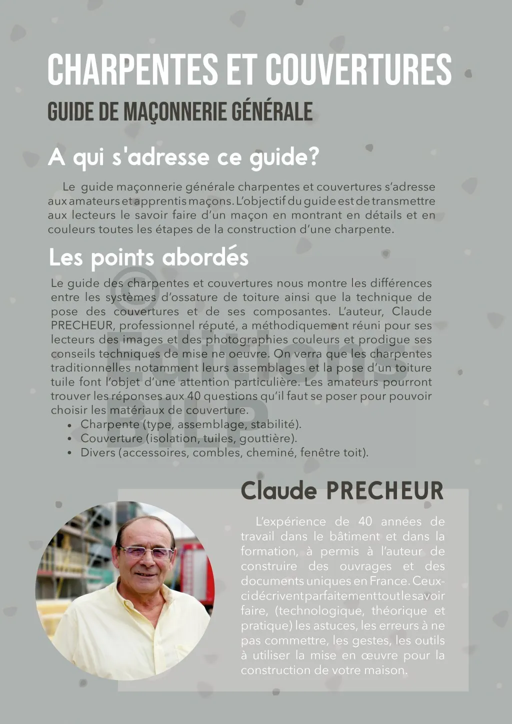 L’expérience de 40 années de travail dans le bâtiment et dans la formation, a permis à l’auteur de construire des ouvrages et des documents uniques en France. Ceux-ci décrivent parfaitement tout le savoir faire, les astuces, les erreurs à ne pas commettre, les gestes, les outils à utiliser et la mise en œuvre pour la construction de votre maison. Que ce soit la construction principale, les annexes, les extensions, la rénovation ou les simples travaux d’extérieur. Le tout pédagogiquement afin que chacun d’entre nous puisse comprendre et mettre en pratique les conseils fournis.