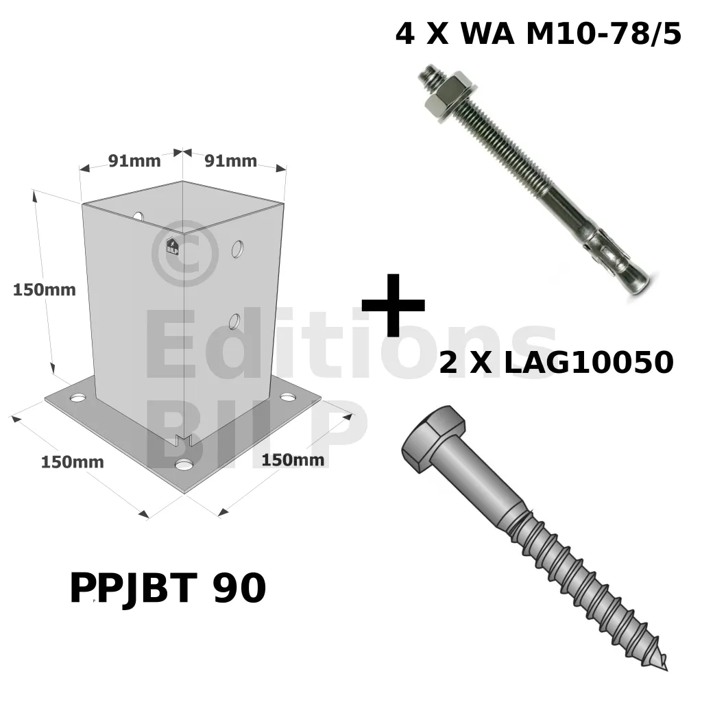 - 1 pied de poteau PPJBT70 ou PPJBT90 en acier galvanisé à chaud,