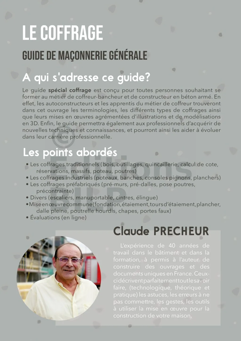 Le guide « Le coffrage » est le tome IV du pack « Expert ». Cet ouvrage est la mise en pratique des théories et astuces dans le Tome I, et est complémentaire avec le Tome III, du fait que le façonnage d’un ouvrage en maçonnerie nécessite un coffrage efficace.