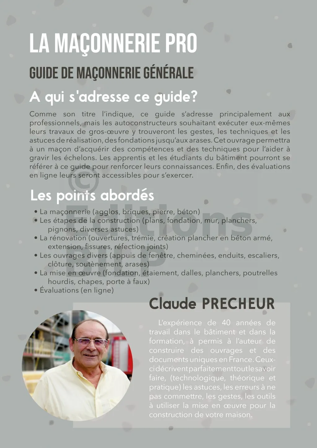Le guide « La maçonnerie PRO » est le tome III du packs « Expert ». Cet ouvrage est la mise en pratique des théories et astuces dans le Tome I, et est complémentaire avec le Tome IV, du fait que le façonnage d’un ouvrage en maçonnerie nécessite un coffrage efficace.