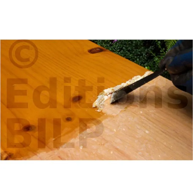- Enlever la pâte obtenue avec une spatule ou une brosse à chiendent en nylon (selon dureté du bois). Sur bois fragile ou sur support intérieur pour un aspect soigné, préférer une brosse en laiton doux. Rincer le DSP 800 à l’aide d’une éponge humide imbibée d’eau tiède (attention à ne pas relever la fibre du bois, si besoin égrener avec du papier abrasif de grain moyen à fin).