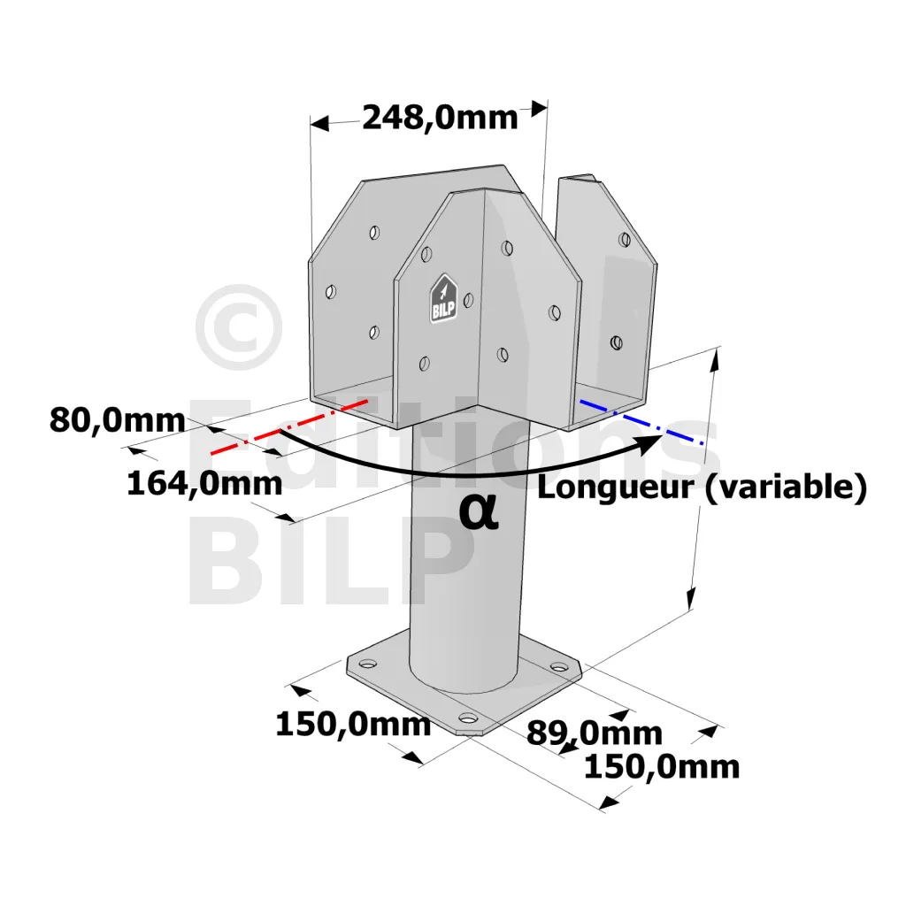 Poteau structurel OSP - D89mm - Platine haute en T 80x164x150mm - Embase 150x150mm - Réf. SP1-SP8Ø89_80x164