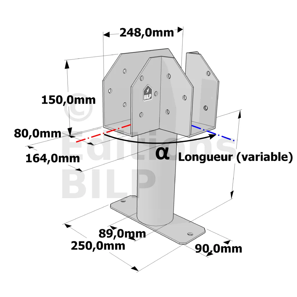 Poteau structurel OSP - D89mm - Platine haute en T 80x164x150mm - Embase rectangulaire 90x250mm - Réf. SP5-SP8Ø89_80x164