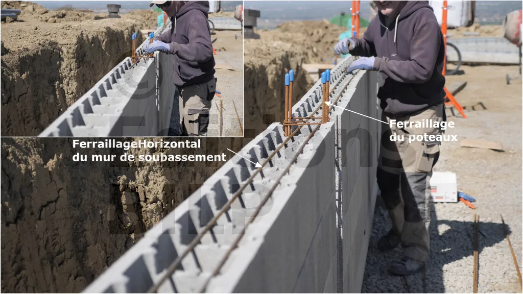 - Les armatures transversales de la longrine qui gênaient ont été pliées car elles ne pouvaient pas être coupées pour assurer la liaison entre le mur et la longrine.