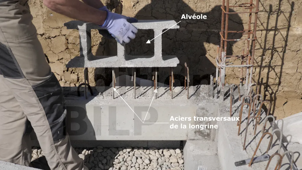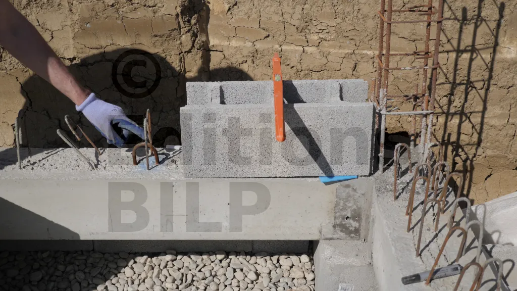 - Sur la partie où il a les boucles de levage, quand celles-ci empêchent la pose du bloc, leurs positions ont été projetées sur le bloc à bancher pour y faire des entailles.