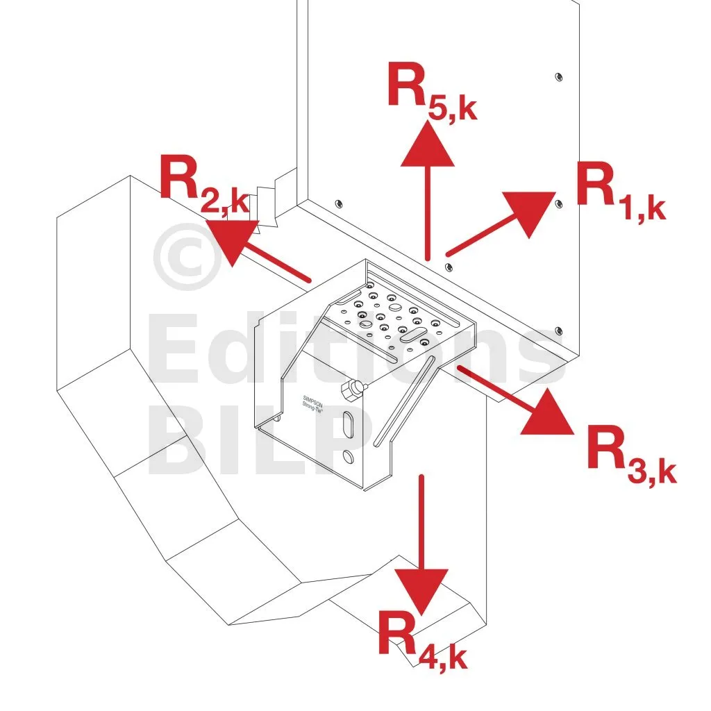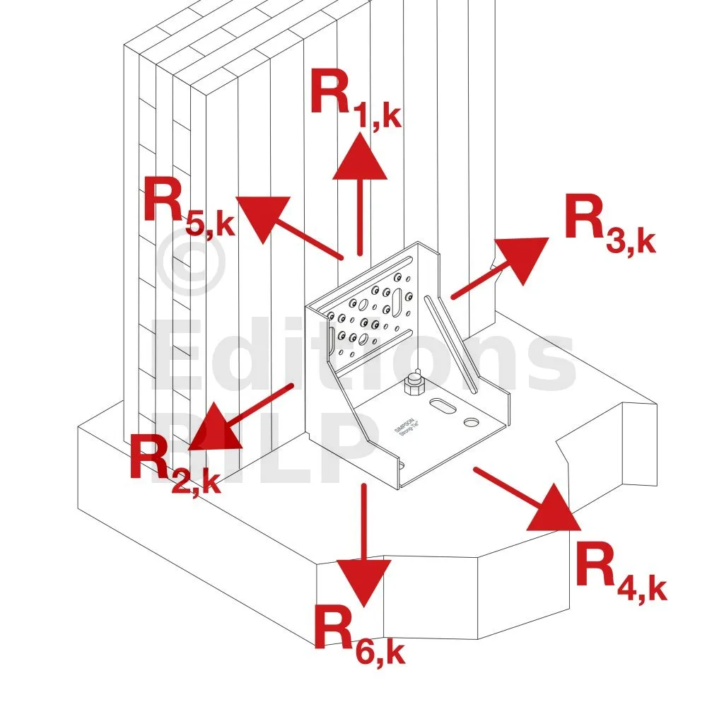 Les résistances données dans ce tableau sont des résistances maximum. Il convient de vérifier la reprise de charge des ancrages. Si les ancrages n’ont pas une capacité suffisante, les charges de l’ACW155 doivent être réduites. De même, si la fixation à l’élément bois est réalisée avec des boulons ou des tirefonds, il faut alors vérifier que la charge puisse être reprise par ces fixations. Enfin, les reprises de charges données pour la configuration "Sur la dalle" sont vraies uniquement s’il n’y a pas de rotation possible de l’élément bois.