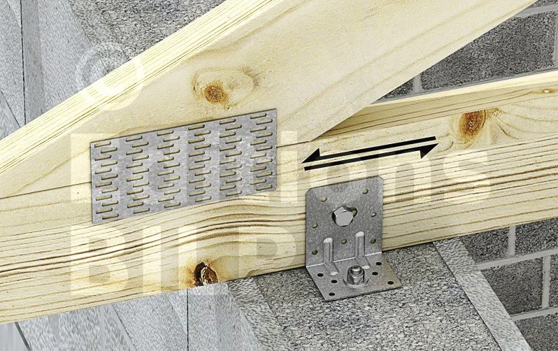 Dans le cas d’un déplacement calculé de la ferme de plus de 6 mm, il faut alors réaliser un appui glissant. Le glissement est autorisé par le trou oblong situé sur nos équerres (source DTU 31.3, P3/5.3.3)