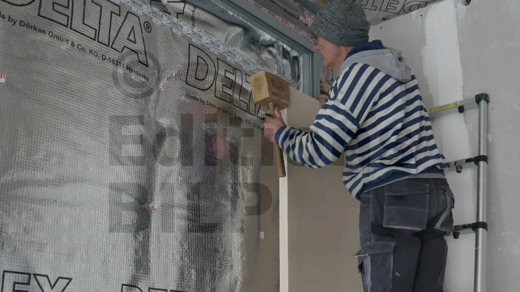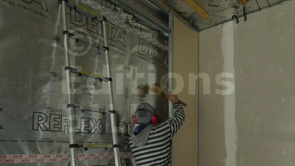 Nous poursuivons ainsi l’avancement du doublage, panneau après panneau, en insérant les montants et en les sertissant au fur et à mesure dans les rails. Il faut vérifier régulièrement la verticalité des montants et la continuité de l’isolant.