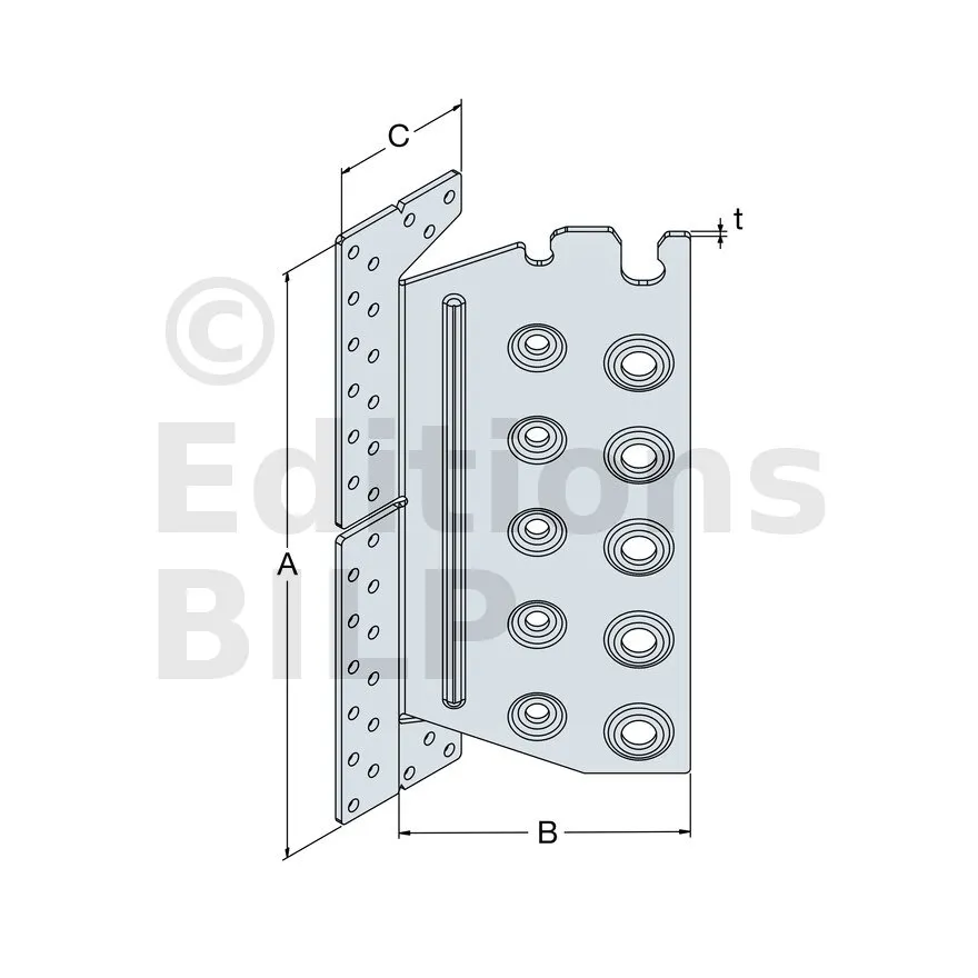 | Largeur | Hauteur | Largeur poteau | A | B | C | t | α [°] | Ø5 | Ø8,5 | Ø12,5 | ||||||