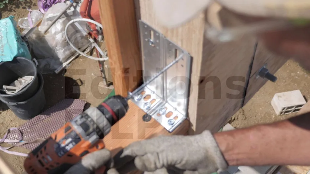Les linteaux s’appuient sur des poteaux situés au niveau des ouvertures. Afin d’éviter l’utilisation de vis très longues, ils ont été fixés contre l’ossature des murs à l’aide d’équerres renforcées CLASSIQUES asymétriques.