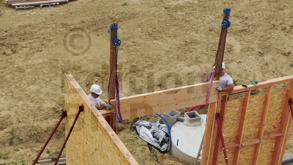 Les palans ont été fixés sur deux poteaux montés sur les ossatures des murs, à une hauteur supérieure à celle du linteau. Les deux extrémités du linteau ont été attachées à l’aide de sangles, lesquelles ont été accrochées aux chaînes des palans. Pour effectuer le levage, il est nécessaire d’être au moins deux personnes, qui doivent agir de manière parfaitement coordonnée pour éviter tout accident. En effet, pendant le levage, les chaînes des palans doivent être tirées simultanément afin que le linteau reste stable et ne risque ni de s’incliner ni de tomber.
