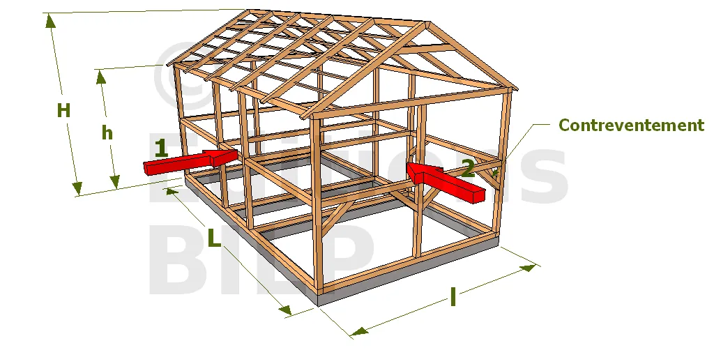 - 1 : Vent long pan (lorsque le vent souffle sur la longueur du bâtiment)