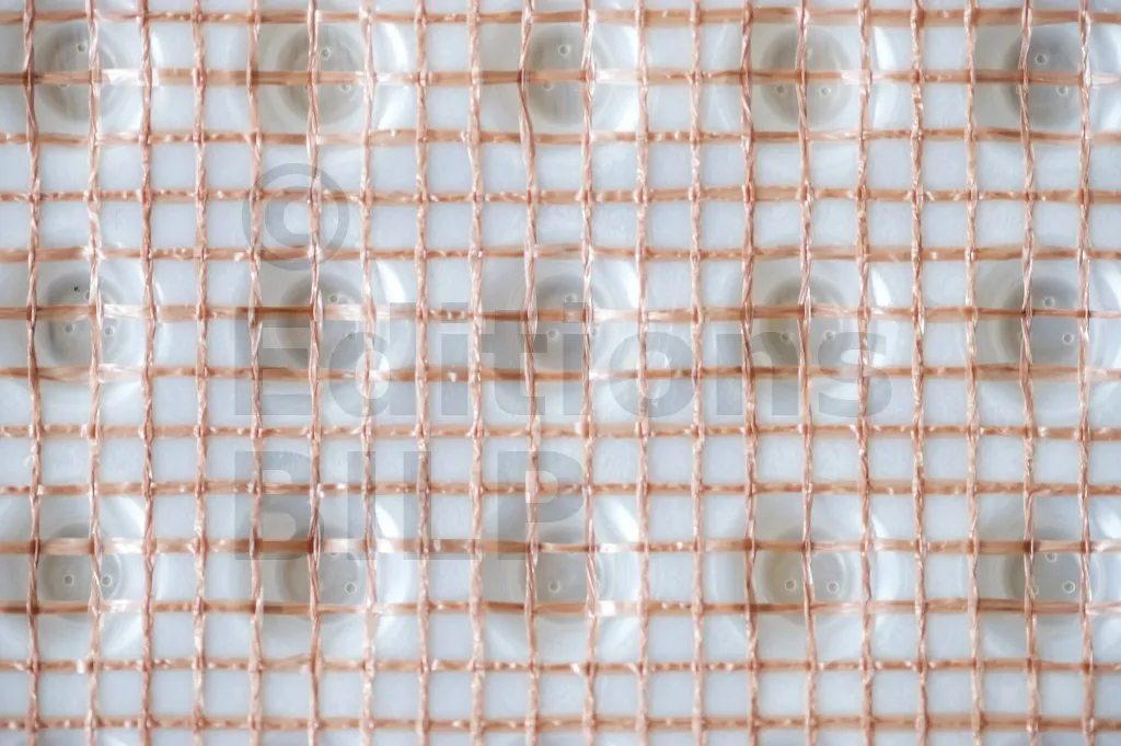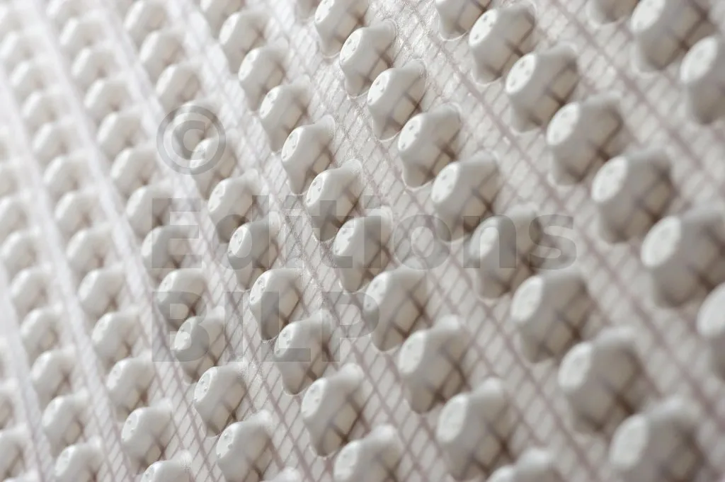 - MatériauNappe à excroissances en polyéthylène haute densité associée à un treillis en polyéthylène brun.