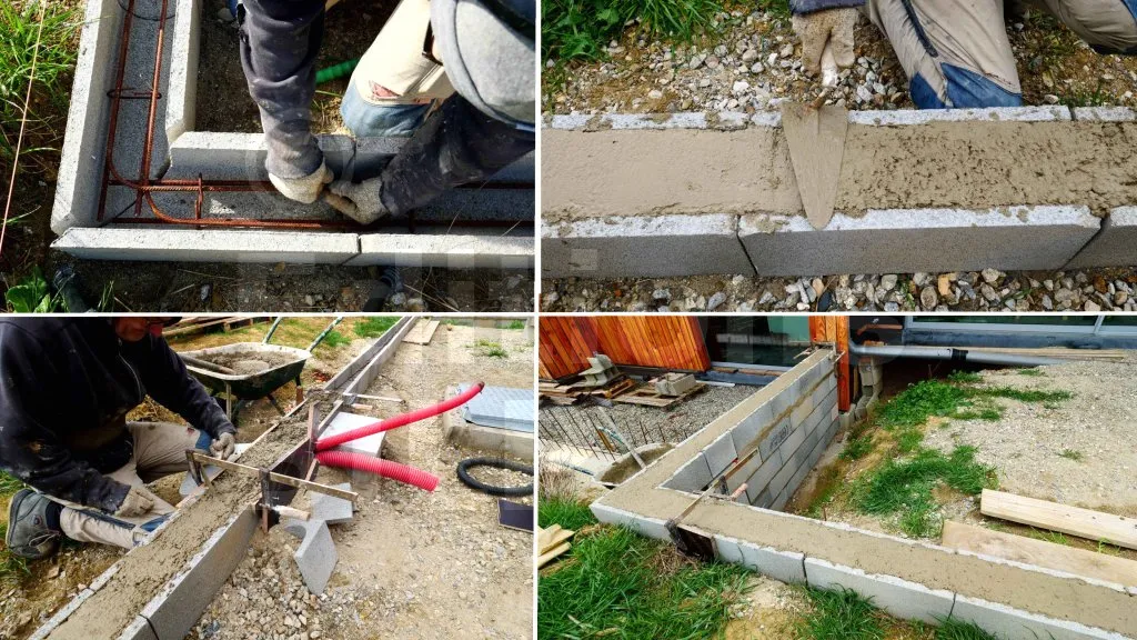 Le chaînage bas est la ceinture porteuse qui lance l’ouvrage : c’est un premier rang en blocs U, ferraillé puis bétonné, offrant une assise plane, rigide et continue. Il stabilise le muret ou la longrine, répartit les charges et limite les fissures grâce à un ferraillage soigné (longitudinaux, étriers, recouvrements et continuités aux angles).
