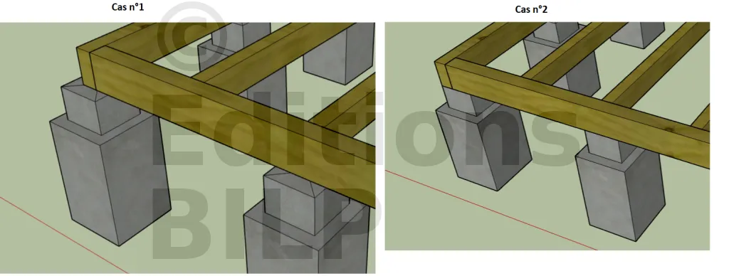 Les plots sont reliés entre eux par des longrines, constitués de poutres de béton armé ou précontraint, disposées horizontalement sur des fondations en plots ou en semelles qui supportent les planchers et les murs. Les longrines permettent de répartir les charges sur les fondations et de garantir la rigidité de la structure. En bois lamellé-collé, elles sont utilisées pour des portées jusqu’à 8 m.