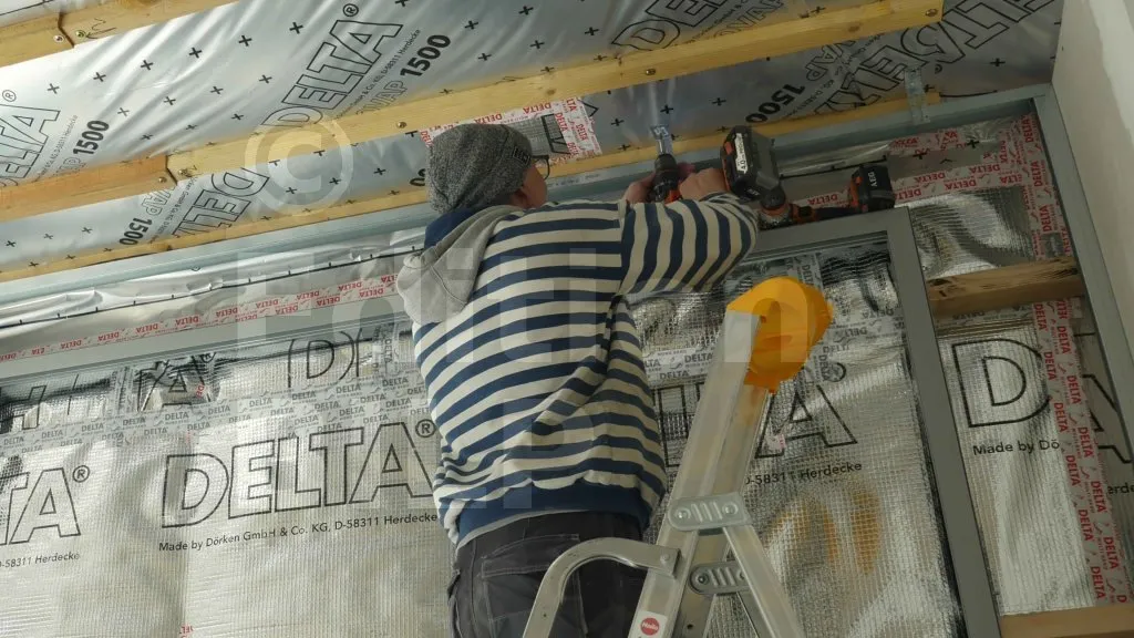 Le rail du haut est fixé au plafond à l’aide d’équerres. Ces équerres permettent d’ajuster précisément la position du rail en le maintenant à la bonne hauteur, tout en assurant un ancrage fiable dans la structure porteuse du plafond. Ce système est particulièrement utile lorsque la charpente ou le plafond n’offre pas une surface régulière ou horizontale.