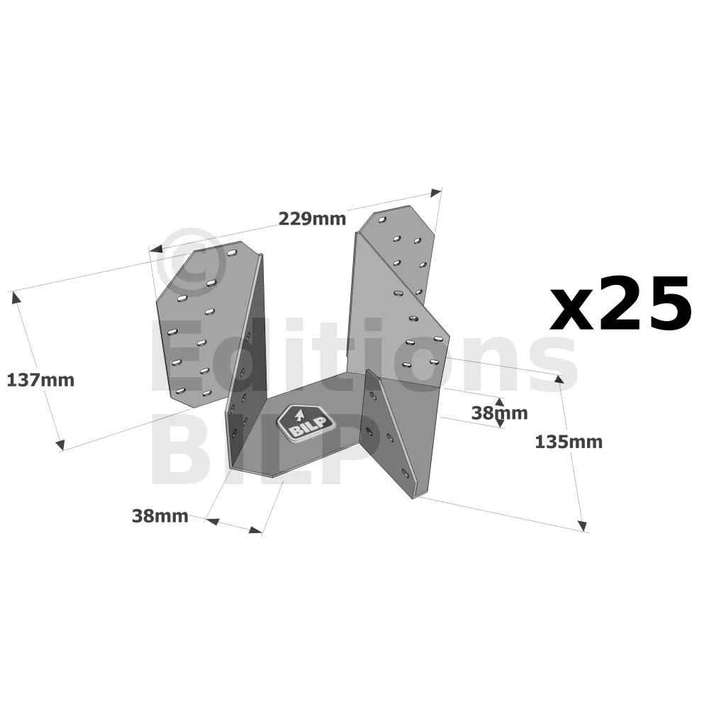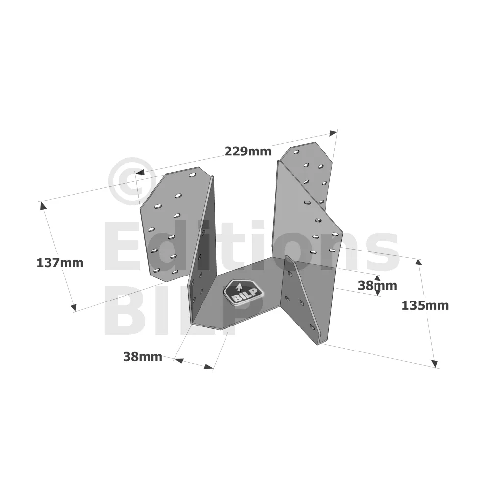 L’étrier pour croupe THJA26 est utilisé dans la fermette de section 38mm. Il permet la réalisation d’une croupe en assemblant les demi-fermes d’arêtier et d’empannon.