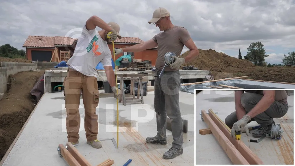 Cette méthode est très efficace, mais le lève-mur est très lourd et peu pratique pour les bâtiments ayant une grande emprise, comme la maison BILP. La structure de ce lève-mur est constituée de poteaux équipés de poulies, renforcés par des contreforts. Le système de levage est actionné par un cric électrique muni de cordes pour soulever les murs à la verticale.