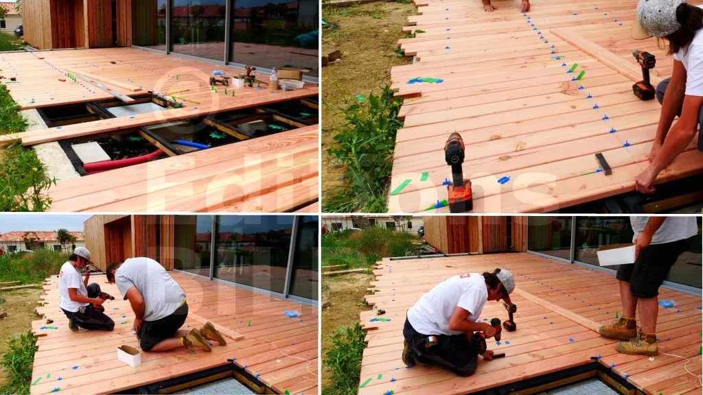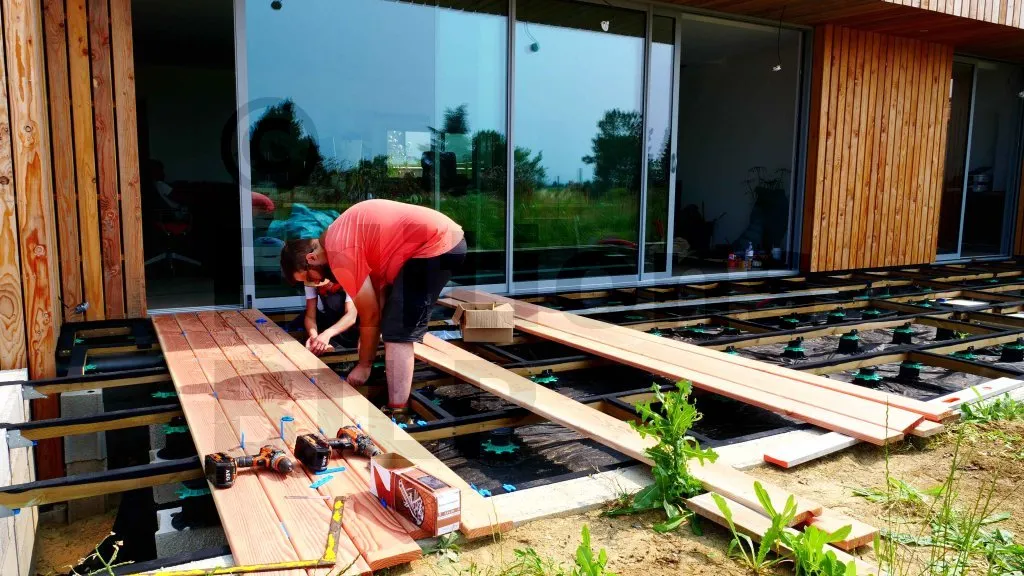 Avant de procéder à la pose des lames, on recouvre le dessus des lambourdes avec une bande d’étanchéité auto-adhésive, là où les lames s’appuient, afin de protéger cette zone de contact tout en laissant le bois respirer. Le sens de pose des lames se choisit en fonction de plusieurs paramètres : la pente d’écoulement de l’eau, la manière dont on circule sur la terrasse, la position des vues principales… mais aussi l’esthétique globale de la façade. Dans le cas de la maison BILP, les lames ont été posées dans le même sens que le bardage des murs pour prolonger visuellement les lignes du bâtiment.