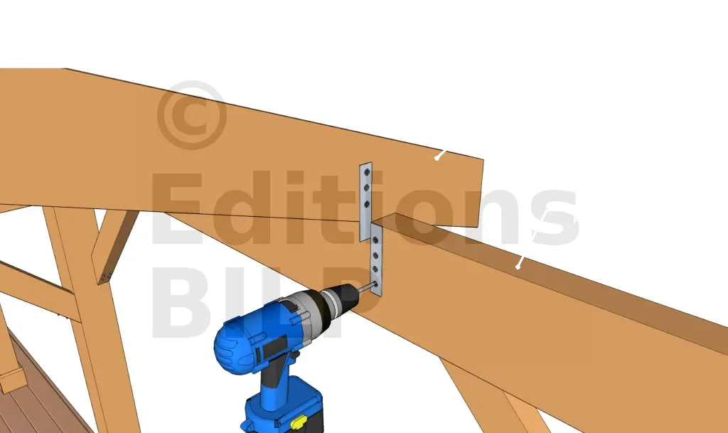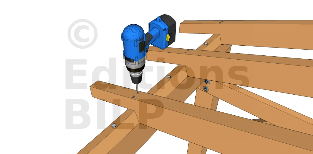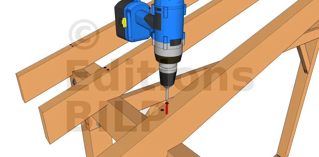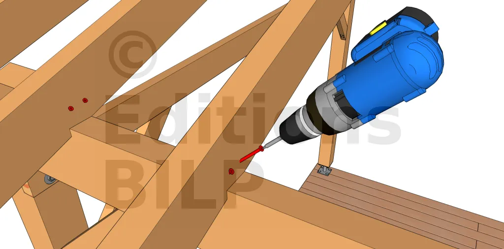 On insère 2 vis à 45° sur les 2 faces de chaque chevron de façon à traverser le chevron et à le visser dans la panne. La longueur des vis doit donc être suffisante. C’est une technique permettant une certaine économie et qui fonctionne avec des chevrons de toutes les hauteurs mais n’est pas plus fiable que la technique précédente.